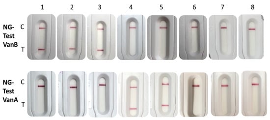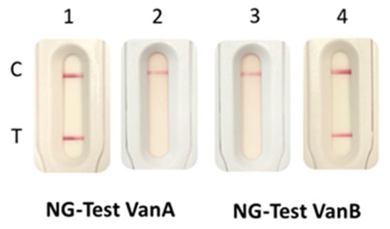 For bacterial colonies, a 1-µL loop full of bacteria grown on the different agar plates was added to 100 µL extraction buffer (EB, provided by NG Biotech supplemented with 80 µg/mL of lysin (EB-80)). For bacterial broth culture, 500 µL culture was centrifuged in a table top Mikro 200R (Hettich, Sérézin du Rhône, France) for 5 min at 10,000 rpm (7000× g), and the pellet was resuspended in 100 µL of EB-80 as previously described [12,15]. After an incubation of 5 min at room temperature, the extract was loaded onto the cassette. The result was eye read after 15 min of migration by monitoring the appearance of a red band specific for VanB (test line, T), along with a band corresponding to the internal control (control line, C).