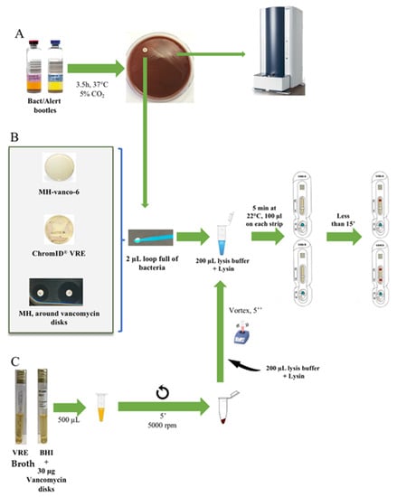 Positive blood cultures with spiked enterococci (8 VanB-VREs, 7 VanA-VREs and 8 non-VanA and Van-B-VREs) were directly tested using 500 µL of positive blood culture processed using a modified broth protocol. The 500 µL positive blood culture was centrifuged for 5 min at 10,000 rpm (7000× g), and the pellet was resuspended in 500 µL of wash buffer, re-centrifugated and resuspended in 100 µL of EB-80 [12,15]. In addition, positive blood cultures were sub-cultured for 3.5 h on Chocolate agar PolyViteX plate (bioMérieux) with a 5 µg vancomycin-containing disk (Bio-Rad) Subsequently, colonies grown around the vancomycin disk were used for NG-TEST VanA [12] and NG-Test VanB assays, while other colonies were used for bacterial identification using the MALDI-TOF mass spectrometry identification system (Maldi Biotyper, Brucker Hamburg, Germany), as routinely performed in our laboratory. This process mainly consisted of the transfer of a thin layer of colonies onto a MALDI target (without transferring agar). Each sample was subsequently overlaid with 1 μL of 70% (v/v) formic acid and 1 μL of the matrix solution, which was dried at room temperature.