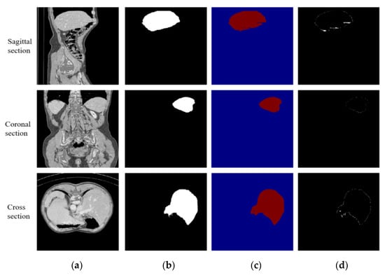 In the first stage, DCUNet-Liver contains four dense blocks; therefore, four transition layers are added, and each transition layer is composed of batch normalization (BN), an activation function, convolutional layer (1 × 1 × 1), and pooling layer. The role of the transition layer is to reduce the redundant feature maps generated by dense blocks and downsample the feature maps. The segmentation results obtained by the liver localization module on the sagittal, coronal, and cross-sections are shown in Figure 4.