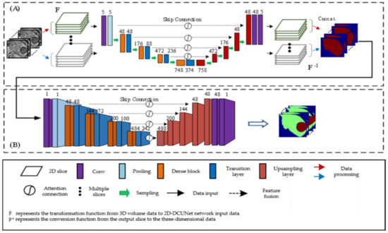 DCUNet-Tumor network structure diagram: (A) a two-dimensional U-Net network; (B) a three-dimensional U-Net network.