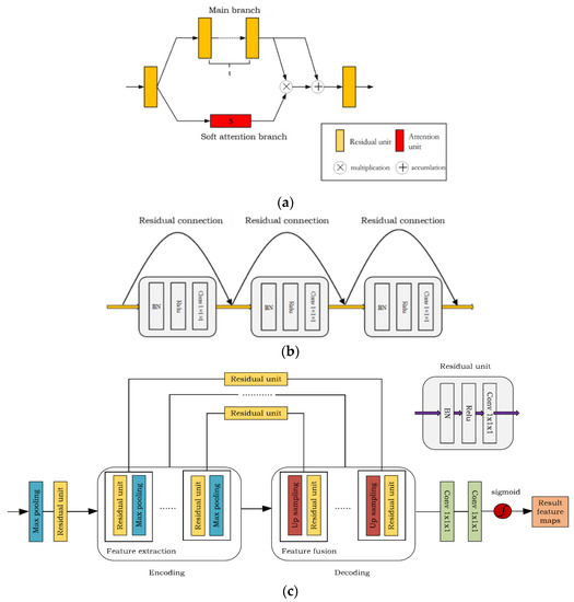 The lesion areas of the liver tumors in different patients vary greatly, and the size, location, and shape of the tumors are different, especially for small tumors, which increases the difficulty of recognition. The convolution neural network will lose the information of small tumors and reduce the segmentation accuracy of tumors when extracting features. To solve this problem, the proposed algorithm adds the attention module to the skip connections of the DCUNet-Tumor network, which makes the neural network pay more attention to the liver tumor areas, so as to improve the segmentation accuracy of liver tumors. The attention module structure is shown in Figure 6a, which includes the main branch and soft attention branch. The main branch structure is a general residual network composed of multiple residual units, which include the BN layer, ReLU activation function, and 1 × 1 convolutional layer, shown in Figure 6b. The soft attention branch is composed of an encoding and decoding architecture, which focuses on extracting the context information of the small tumor areas in the image, shown in Figure 6c.