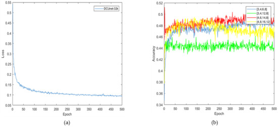 In the liver localization stage, the number of micro blocks in dense blocks is an important parameter for the performance of the neural network. To optimize the effectiveness of this parameter, we compare five selections, which are (4, 6, 14, 8), (3, 4, 6, 8), (3, 4, 12, 8), (4, 6, 14, 8), and (4, 8, 16, 12), respectively, and the results are shown in Figure 7b. When the micro block numbers are (4, 8, 16, 12), the model’s accuracy first stabilized and then gradually declined, which indicates that the micro block numbers with larger values may cause over-fitting and reduce the neural network’s performance. When the micro block numbers are (3, 4, 6, 8), the curve of the segmentation accuracy is the lowest, which indicates that the micro block numbers with smaller values cannot obtain sufficient parameters to accurately segment liver and tumors. Therefore, based on the experimental results, the proposed algorithm set the micro block numbers as (4, 6, 14, 8).