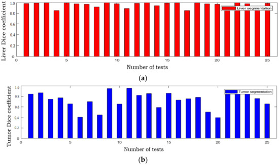 The Dice coefficient of the segmentation results of the proposed algorithm in the test set on 25 CT sequence images: (a) Dice coefficient of the liver segmentation results; (b) Dice coefficient of the tumor segmentation results.