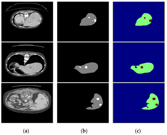 The segmentation results of our algorithm for multiple liver tumors: (a) CT original images; (b) the real segmentation results; (c) our segmentation results.