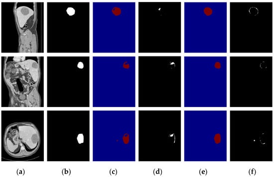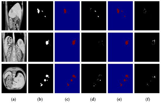 Segmentation result of a multiple-tumor area; the first row is the sagittal plane, the second row is the coronal plane, and the third row is the transverse plane. (a) CT image; (b) Ground truth; (c) DenseUNet segmentation results; (d) difference image between DenseUnet and ground truth; (e) the proposed algorithm’s segmentation results; (f) difference image between the proposed algorithm and ground truth.