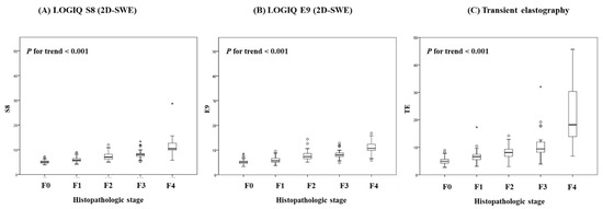 | Histopathologic Stage | 2D-SWE (S8) | 2D-SWE (E9) | TE | |