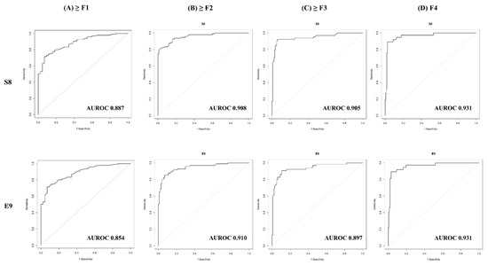 3.2. Diagnostic Performances of S8 2D-SWE, E9 2D-SWE and TE for Distinguishing Liver Fibrosis Stage