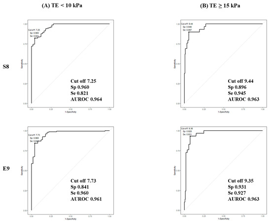 | TE ≥ 15 kPa | 2D-SWE (S8) | 9.44 | 0.896 | 0.945 | 0.963 |