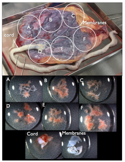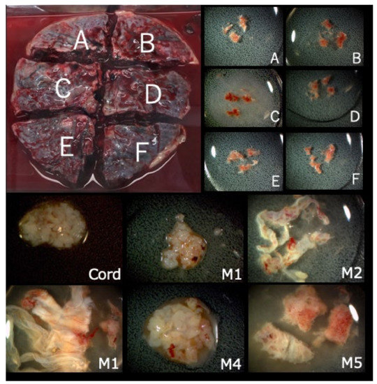 Collected placenta and tissues from each part. The placenta was divided into four or six parts (upper figure, A–F parts) and tissue from each A–F parts (lower figure) was extracted from each A–F part, along with the cord and membrane tissue for further genetic tests.