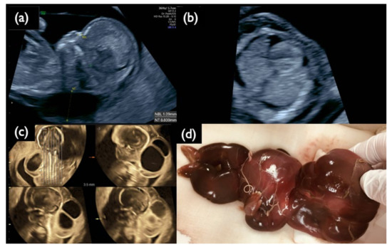 Sonographic findings at 11+6 weeks, and 17 weeks, and IUFD fetus after delivery in Case FP1. (a) Mid-sagittal section of the fetal head. Nuchal translucency (NT) of 8.8 mm and a small nasal bone are demonstrated. (b) Horizontal section of the thoracic area. Pleural effusion is visualized bilaterally. (c) 3D tomographic ultrasound image in the sagittal section with a coronal guide section (left upper). General edema and large cystic hygromas are shown. (d) Picture of the dead fetus on delivery at 20 weeks. The fetus died in utero at 19 weeks of gestation.