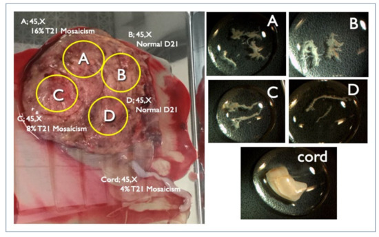 Genetic results of the placenta and cord delivered at 20 weeks in Case FP1. Intrauterine fetal demise occurred at 19 weeks due to hydropic Turner syndrome. The left figure is the placenta with the FISH results. Right figures are each specimen of A, B, C, and D chorionic villi and cord from each placental A, B, C, D part and cord (left figure) respectively for genetic investigation.