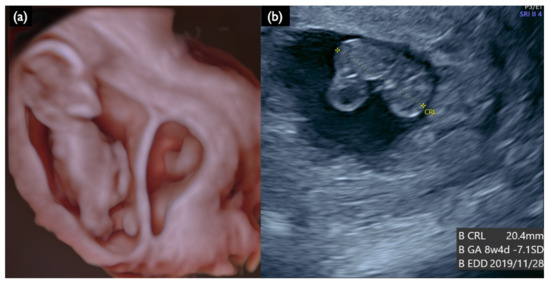 Sonographic findings at 13 weeks and 4 days of a DCDA vanishing twin with the second sac containing a nonviable fetus (Case FP2). (a) 3D reconstructed image. Small dead embryo exists in the smaller gestational sac. (b) Crown lump length (CRL) of a nonviable fetus was 20.4 mm, compatible with 8 weeks and 4 days.