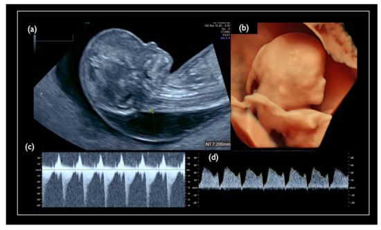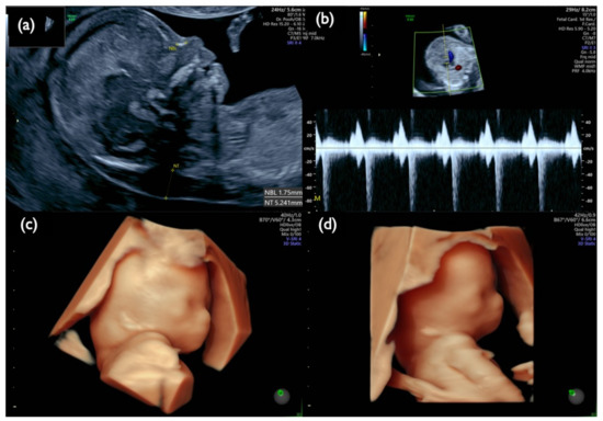 Fetal ultrasound scan of Case Mo4 at 13 weeks. (a) Mid-sagittal section of the fetal head. Nuchal translucency (NT) of 5.2 mm and small nasal bone are demonstrated. (b) Tricuspid regurgitation. (c,d) 3D reconstructed fetal face. A flat profile with a low-set ear and swollen eye bags are clearly demonstrated.