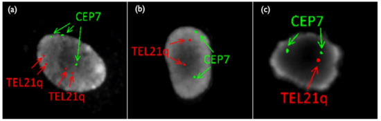 FISH results of placental sample in Case Mo2. (a) Tetrasomy 21/Trisomy7 (b) Disomy21/Disomy 7 (c) Monosomy21/Disomy 7. TEL21q: telomere probe for 21 long-arm, CEP 7: centromere (D7Z1) probe for chromosome 7.