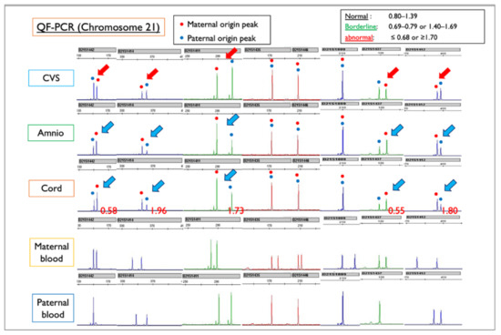 QF-PCR results for each sample of Case Mo4, compared with the maternal and paternal blood sample. CVS: chorionic villus sample; Amnio: amniotic fluid sample. Red figures ≤0.68 or ≥1.70 indicate Trisomy 21. In this case, maternal and paternal peak patterns show the normal disomy of chromosome 21. In the amniotic fluid and cord samples, the blue arrows indicate that the peak of chromosome 21 of maternal origin is higher than that of paternal origin, a finding that is suggestive of T21. In contrast, in the CVS sample, the red arrows indicate that the peak of the mother-derived chromosome 21 is lower than that of the father-derived chromosome 21, suggesting the presence of more M21 than T21. From the QF-PCR analysis, we concluded that the Robertsonian T21 was created as an isochromosome with a duplicated long arm of maternal chromosome 21.