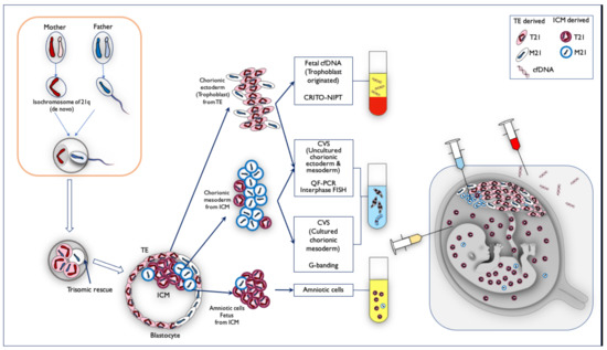 From all of the genetic results, and the fact that the Robertsonian translocation of the isochromosome originated from the mother, we estimated the mechanism of the discordant mosaicism ratio among the fetal cfDNA, QF-PCR, and the interphase FISH of CVS, cultured CVS, and amniotic samples, illustrated in Figure 11. First, the oocytes of de novo isochromosome 21 were formed during the meiosis of the mother, and the fertilized eggs became T21 with the mother-derived isochromosome 21. The M21 cell line arose because of trisomic rescue at the early stage before the blastocyst. Both the trophectoderm (TE), and the internal cell mass (ICM), in the blastocyst became a mosaicism of Robertsonian T21 and M21. Eventually, M21s were present in some part of the trophoblast and most of the chorionic mesoderm. Most of the ICM containing Robertsonian T21 cells became the amniotic cells and fetus.