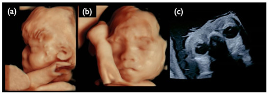 Ultrasound images at 30 weeks of gestation in the NC1 case. (a) 3D ultrasound image of the fetal profile. (b) 3D ultrasound image of the frontal face of the fetus. (c) Ultrasound image of fetal eye sand lenses on both sides. All images show that the fetus is hypertrichotic and has no ocular lesions at this gestational age.