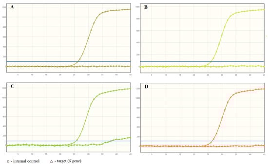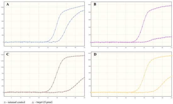 The use of the BD MAX™ System, which combines RNA extraction and real-time RT PCR, provides results in a shorter time. Depending on the number of samples tested, the time does not exceed three hours, including the sample preparation stage. In most cases, a specific shape of the amplification curves is obtained for the positive results. Research by Navarathna et al. [] showed that this system interprets many samples as positive, even though they are actually negative. This is mostly due to the non-specific shape of the amplification curves which cross the threshold line. In our study, only two such plots were obtained (Figure 1C and Figure 2B). Both of these samples were SARS-CoV-2 true positive; however, one of them was a false negative when repeating the reaction on the BD MAX™ System afterwards (Figure 1D). It might have resulted from the low number of RNA copies in the specimen or from RNA stability in the sample. This situation underlines the necessity of careful interpretation of the obtained results and verification of the status of such samples using other diagnostic kits. We also found a high sensitivity in the VIASURE SARS-CoV-2 S gene Real Time PCR Detection Kit and thus a very low number of false-negative results, which is opposite to the observations reported by other researchers [].