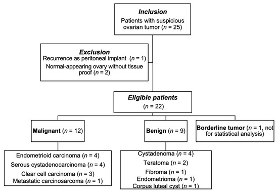 Overall, 21 patients were eligible for final analysis (age range, 41–67 years; median, 41.5 years), with patient the demographics summarized in Table 1. The benign group comprised four cystadenomas, two teratomas (Figure 2), one fibroma, one endometrioma, and one corpus luteal cyst. The malignant group comprised four serous cystadenocarcinomas, four endometrioid carcinomas (Figure 3), three clear cell carcinomas (Figure 4), and one carcinosarcoma.