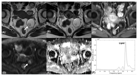 Mature cystic teratoma in a 67-year-old woman. Axial (A) T1-weighted, (B) T2-weighted, and (C) contrast-enhanced T1-weighted MR images show a left adnexal cystic mass with fatty content. Axial (D) high-b-value DW image (b = 1000 s/mm2) and (E) ADC map demonstrated mild restricted diffusion of the solid nodule (arrow). The tumor was classified as an O-RADS 3 lesion. (F) MR spectroscopy depicts prominent resonances corresponding to lipids (demonstrated using the FID-A toolkit [16]).