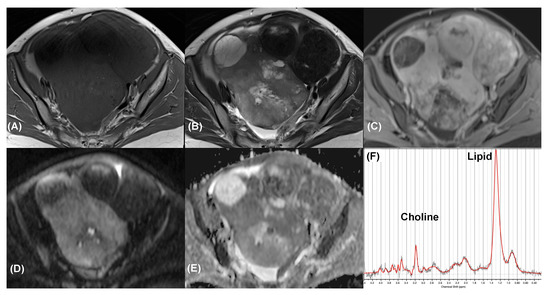 Magnetic resonance imaging (MRI) has been proven to exhibit higher diagnostic accuracy than other imaging modalities in differentiating between malignant and benign lesions of the ovary [4]. MRI lexicon and scoring systems have been developed to optimize the characterization of adnexal lesions [5,6]. A recent multicenter cohort study using an MRI O-RADS score of 4 or 5, demonstrated a sensitivity of 93% and a specificity of 91% regarding the identification of malignant ovarian tumors [7]. However, these scoring systems require dynamic contrast-enhanced T1-weighted images for comparing perfusion curves between the myometrium and adnexal lesion, but the myometrial signal is not measurable in post-hysterectomy patients. Gadolinium-based MRI contrast agents are also not feasible for use in pregnant women or patients with impaired renal function [8]. Nonenhanced MRI techniques, such as diffusion-weighted imaging (DWI) and magnetic resonance spectroscopy (MRS), might add value to the use of MRI O-RADS. DWI measures the diffusivity of water molecules, which indicates the cellularity of lesions and potentially improves diagnostic confidence in the differentiation of malignant and benign ovarian lesions [4]. In clinical proton (1H)-MRS, detecting the total choline signal has demonstrated initial utility in characterizing cancers of the brain, prostate gland, and breast. MRS acquisition is feasible in normal ovaries and the solid part of tumor masses [9,10,11,12], but its clinical application for diagnosing ovarian tumors and making treatment decisions remains unexplored.