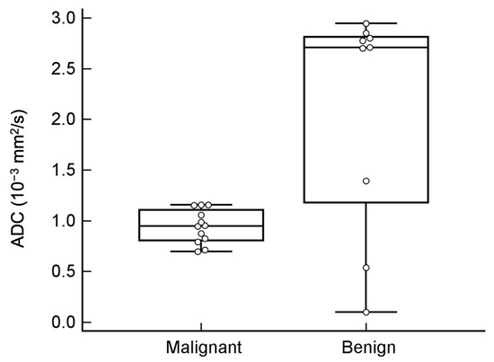 Our study identified a significant correlation between DWI hyperintensity and malignant masses, which is consistent with previous reports that have used b values of 0 and 1000 s/mm2 [21,22]. For the fibroma, a benign ovarian tumor with limited specificity was noted because of dense cellularity that resulted in restricted diffusion on DWI [23]. Several other benign female pelvic tumors, chiefly endometriomas, dermoid cysts, and fibroids, can also exhibit restricted diffusion [24]. Even normal ovaries may exhibit restricted diffusion, and thus, image interpretation in conjunction with the results of other image sequences is essential. The probable cutoff value of the ADC value to differentiate between malignant and benign adnexal masses was reported to be 1.13 × 10−3 mm2/s in previous literature [25,26] and 1.27 × 10−3 mm2/s in our study. However, the ADC values of two teratomas (0.54 × 10−3 mm2/s and 0.99 × 10−3 mm2/s, respectively) were lower than these cutoff values and were found to be lower than those of malignant masses in our study; these results are comparable with those of Kim et al. [22], which might explain the high sensitivity but low specificity of using ADC cutoff values alone as an indicator of malignancy. Hence, the diagnoses of teratomas or fibromas using solely DWI should be interpreted cautiously.
