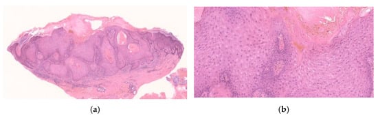 Histopathologically, CFV is characterized by finger-like exophytic projections associated with hyperkeratosis (parakeratosis or orthokeratosis), focal hypergranulosis (koilocytes are not always prominent) and acanthosis, together with epithelial lip-like structures at the periphery (Figure 8). Characteristic inturning of elongated rete ridges (arborization) is usually observed (Figure 8). CFV can be differentiated from KA because it consists of several lobular structures composed of the proliferation of keratinocytes of a similar size and regular arrangement and because the base of CFV is well demarcated without endophytic growth. Cells with a large eosinophilic cytoplasm may be found in some parts of CFV, but these cells exhibit no downward proliferation unlike in KA (Figure 8). There is generally no nuclear atypia in the basal cell layer, or it is very mild if present, in contrast to the obvious nuclear atypia and mitosis of proliferating keratinocytes at the periphery of early-stage KA. There is either no inflammatory cell infiltration or slight infiltration (mainly lymphocytes and plasma cells), whereas KA in the regressing stage demonstrates fibrosis of dermal papillae and mixed inflammatory cell infiltration. CFV with large pink cytoplasm and trichilemmal keratinization is also histopathologically similar to so-called trichilemmal keratosis (horn) [18,19], the main histological features of which are trichilemmal keratinization and verrucous epidermal hyperplasia composed of large pale staining keratinocytes.