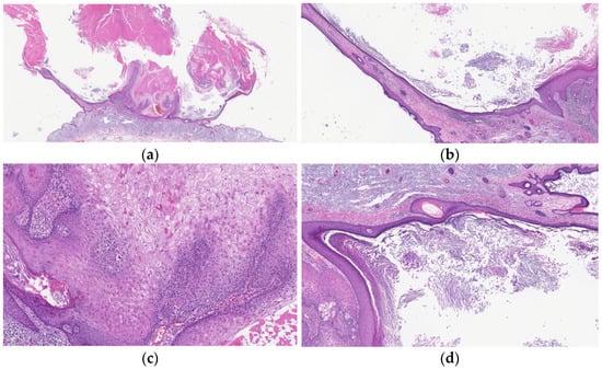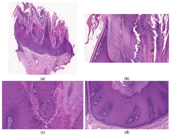 Histopathological findings of CFV. A crateriform configuration with finger-like exophytic projections accompanied (a) by epithelial lip-like structures at the periphery (b) is exhibited. Arborization is observed and the base is well demarcated without endophytic growth (a). Focal hypergranulosis and koilocytes are visible between the papillary projections (c). The lesion consists of several lobular structures composed of the proliferation of keratinocytes of a similar size and regular arrangement (d).