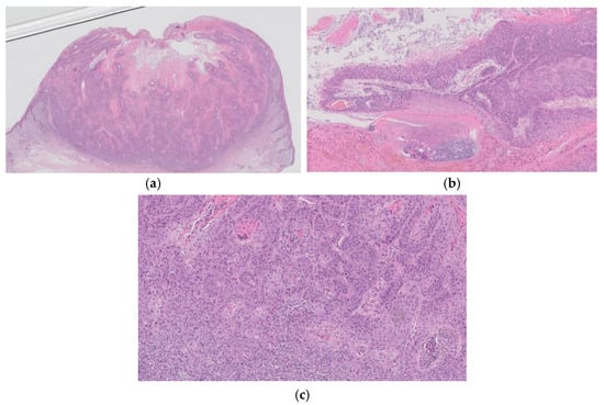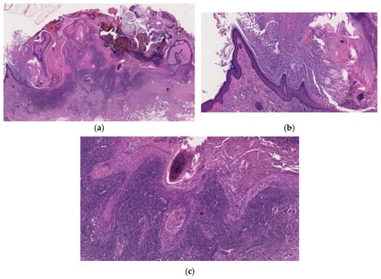 KA-like SCC [9] and KA with malignant transformation (mKA) [15,16] are types of KASCC [10,12,13]. Both types have a component with the histopathological features of KA, e.g., an exo-endophytic lesion formed by invaginated infundibulum and lobules with large pale pink cells having a glassy appearance, generally without nuclear atypia. In KA-like SCC, conventional KA components and SCC components are relatively ill-demarcated and often admixed (Figure 6 and Figure 7). On the other hand, mKA exhibits a well-demarcated contrast between typical KA and SCC sections (nests of anaplastic cells of different shapes and sizes). However, differentiation between these two conditions is often difficult and we found no difference between them in clinical course; therefore, we recommend these tumors be unified as KA with a conventional SCC component (KASCC). KA has a somewhat asymmetrical outline and focally prominent infiltrating border. KA-like SCC is also diagnosed when nuclear atypia is observed in most of the cells constituting the KA-like component (invaginated infundibular structures and lobules of large, pale pink cells). The KA components may be in any stage: early/proliferative, well-developed or regressing. Ratios of the KA and SCC components can vary in each lesion or even in different sections of a single lesion [9,12].