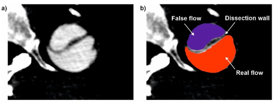 An example of (a) DICOM with (b) indication of False and Real flow and dissected wall.