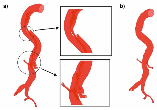 To investigate how the dissection of an aorta’s wall influences the blood hemodynamic, Angio CT data from 12 patients was applied and considered in two cases, before and after surgical intervention, with (Figure 2a) and without (Figure 2b) the aorta’s wall dissection, respectively. Each time DICOM data was applied to extract a model of the aorta to generate the surface object, stored in the stereolithography (STL) format. To achieve the highest contrast between analyzed objects (aorta and surrounding tissues), AngioCT data was manually adjusted for brightness. Moreover, to extract the aorta from the background, the region growing technique was applied. ImageJ software and its tool for morphological hole-filling was used for gap elimination. The implemented segmentation region growing technique provided accurate results, since the aorta gray levels differed significantly from the image background. When compared to manual segmentation performed by the radiologist, the estimated aortas did not differ more than by 5%. For each reconstructed 3D model of the aorta after the segmentation process, a rendering was performed. Moreover, a quantitative analysis of AngioCT data following [21] was used. Brightness to noise (BI), a quotient of analyzed object brightness value and a parameter that defines noise intensity, was calculated. Secondly, contrast to noise ratio (CNR) as a quotient of subtraction of the analyzed object and background brightness to noise intensity was computed [22]. CNR was calculated by placing the region of interest (ROI) in the center of the area represented by the analyzed aorta (reaching 94 ± 3.2 mm2), which corresponds to the image fragment with maximum brightness. This operation was performed for all slices of each patient. The mean of these values was used for further calculations. Image noise was parametrized as a ratio of ROI and standard deviation measured in pixels and calculated for 100 mm2, drawn in two different regions located in the image background (regions without the signal) left and right sides. The brightness to noise was equal to 27.85 ± 1.4, while average contrast to noise ratios was equal to 3.65 ± 0.7.
