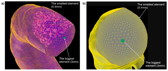 The size of elements inside analyzed part of human vascular system: (a) aorta with wall dissection, (b) aorta without wall dissection.