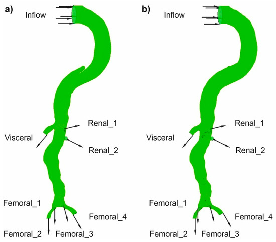 Mathematical domains of the analyzed part of the human vascular system (a) with aorta’s wall dissection, (b) without aorta’s wall dissection. Inlet (Inflow) and outlet (Visceral, Renal, Femoral) areas were marked.