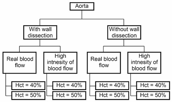 The influence of three parameters on blood hemodynamics in the dissected aorta was investigated: (1) spatial configuration of the wall, (2) blood viscosity, and (3) blood flow intensity (Figure 5). The spatial configuration of the aorta wall, especially during flow through the narrow parts of aorta’s wall dissection, before and after surgical intervention was analyzed. The influence of blood viscosity was included with a changing value of Hct. Finally, two blood velocity profiles in function of time were applied. Thus, calculations were performed for eight cases for each patient; four were performed for the aorta with wall dissection, and another four for the aorta without wall dissection (Figure 5).