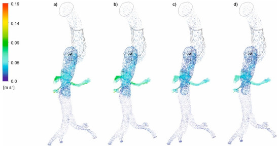 The distribution of blood velocity vectors for an aorta with and without wall dissection for a changing Hct value and blood flow intensity was first analyzed. Blood velocity vector distribution for the representative patients for both cases is presented in Figure 6a–d (with aortic dissection) and Figure 7a–d (without aortic dissection). For both cases, with and without wall dissection, the highest blood velocity was observed for Hct = 40% and high intensity of blood flow. Moreover, with an increase in blood flow and the Hct value, a change in the location of maximum velocity vectors was observed. Furthermore, low blood velocity value was noticed within the proximal false lumen, with slow flow recirculation at the upper right adjacent to the first entry tear. Flow accelerations were observed in bending areas.