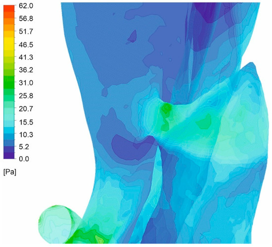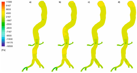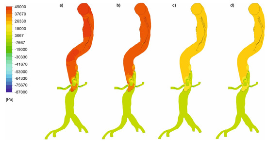 In the next step, we analyzed pressure distribution for the whole mathematical domain. It was observed that static pressure contours for the cases with wall dissection (Figure 8) and without wall dissection (Figure 9) reflected blood velocity distribution as described above.