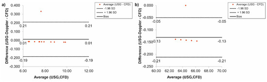 Additionally, the Bland-Altman analysis of the brachiocephalic trunk, for Hct = 40% before TEVAR showed that the difference between CFD and USG-Doppler was equal to 0.02 mL/s for range 0.25 mL/s (Figure 11a), while after TEVAR, the difference was equal to 0.05 mL/s for the range 0.10 mL/s. (Figure 11b).