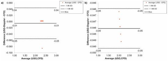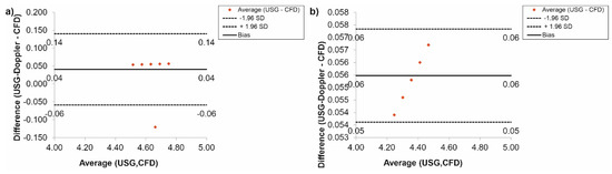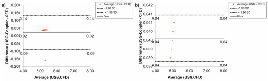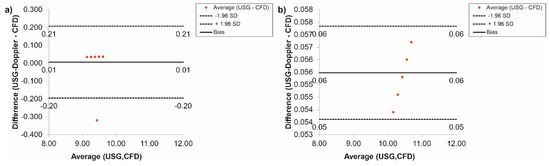 Finally, according to a Bland-Altman analysis of the results for the femoral arteries, for Hct = 40% before TEVAR, the difference between CFD and USG-Doppler was equal to 0.01 mL/s for range 0.10 mL/s (Figure 15a), while after TEVAR, the difference was equal to 0.05 mL/s for the range 0.10 mL/s. (Figure 15b).