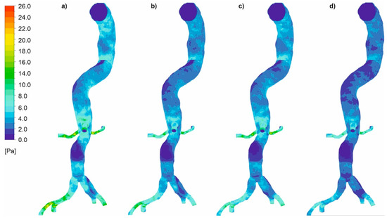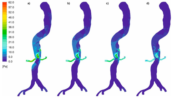 Finally, the distribution of wall shear stress contours for an aorta with and without wall dissection for a changing Hct value and blood flow intensity was analyzed. Wall shear stress distribution for the representative patient for both cases was presented in Figure 16a–d (with aortic dissection) and Figure 17a–d (without aortic dissection). Moreover, the distribution near a gap connection between false and true lumen was presented in Figure 18. The results indicated that for both cases, with and without dissection, the highest wall shear stress was observed for Hct = 40% (average value was equal to 3.79 ± 0.55 Pa and 1.30 ± 0.19 Pa for the case with aortic dissection and without aortic dissection, respectively).