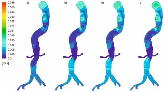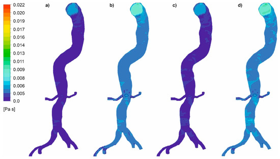 Viscosity distribution for a case without wall dissection for: (a) high intensity of blood flow and Hct = 0.4, (b) high intensity of blood flow and Hct = 0.5, (c) medium intensity of blood flow and Hct = 0.4, (d) medium intensity of blood flow and Hct = 0.5; timestep 3.18 s; values presented as (Pas).