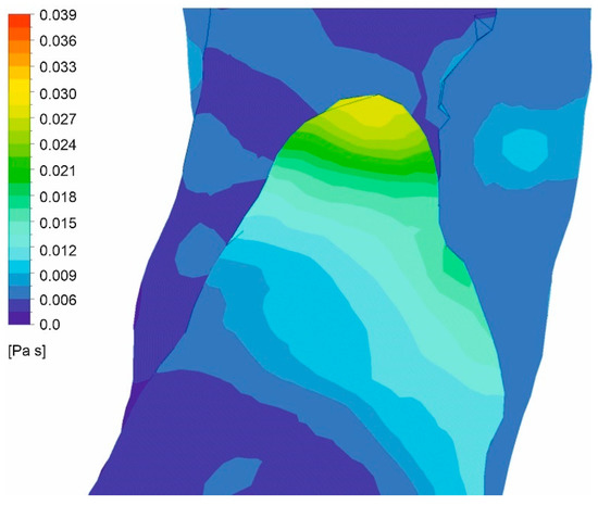 Moreover, viscosity distribution was analyzed for both cases. It was observed that with an increasing value of Hct, which reflects an increase in blood viscosity (Figure 19 and Figure 20), average and maximum values of WSS decreased. Finally, for wall dissection, there were places in the upper part of the aorta where velocity vectors had lower values compared to the case without dissection, which provoked an increase in blood viscosity (Figure 21) and decrease in WSS.