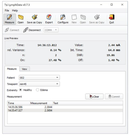 The LymphMeter device has been already described in detail in our recent publication [27]. For the purpose of the current study, the LymphData software was developed to facilitate recording measurements and the import of the data to the secuTrial-based electronic Case Report Form (eCRF) (Figure 1). LymphData supports Windows, MacOS, or Linux based systems. It is connected via Bluetooth to LymphMeter 1.0. When a measurement is triggered by pressing the button on the side of LymphMeter 1.0, LymphData receives and saves the measurement from LymphMeter 1.0 in real time and automatically associates it with metadata, such as the time and date of the measurement (timestamp) and pre-defined parameters such as time point, patient ID and the measured extremity code (healthy or lymphedema). The aggregated data is saved in LymphData’s internal storage system. The measurements can then be exported to files with a particular comma-separated file format that the eCRF data management system can interpret. Therefore, the user can transfer the measurements directly into the eCRF in a semi-automated manner that assures the integrity of the measurements. Moreover, the operating conditions of the LymphMeter 1.0 (i.e., the laser diode integration time or signal-to-background ratio) are also reported to the LymphData software, where they are displayed and saved in the internal storage system together with the actual measurement. If proper operation of the LymphMeter 1.0 is questioned during evaluation of the measurements at a later stage of the study, these recordings can be consulted to investigate whether the device was working properly and was correctly operated. Thanks to its internal database, LymphData can handle prolonged studies over several weeks, interrupted by restarts of the host system, forced closing, power outages, or similar incidences, without any data loss.