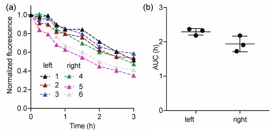 Pig and human skin share similarities in structure and thickness (epidermis varying from 30 to 140 μm and 50 to 120 μm, respectively) [39,40,41]. Thus, we decided to perform a pre-clinical validation of the technology, named LymphMonitor 1.0, in vivo in in pig skin. The LymphMeter 1.0 device was used for measuring the fluorescence signal over time. ICG-HSA was injected into the skin of a 1-month-old female domestic pig using MicronJet600TM microneedles (three pyramid-shaped microneedles, each 600 μm long). Injection with microneedles enables standardized and uniform delivery of the tracer formulation through the epidermis directly to the dermal skin layer [36]. The intradermal injections were performed on the left and right flank, and the signals were measured with LymphMeter 1.0 for a total duration of 3 h (every 15 min during the first hour, then every 30 min). This measurement frequency was chosen to enable observation of the initial signal plateau phase due to diffusion of the dye in the tissue and/or distribution to initial lymphatics dye prior to the clearance phase (signal decrease). Figure 3a shows the normalized clearance curves obtained for the left and right flank of the pig. A plateau phase lasting for 30–45 min was observed for 4 out of 6 injections. As fitting using a mono-exponential decay function to calculate half-life would not be appropriate in this case [27], we calculated the area-under-the curve (AUC) to assess the total clearance of the tracer from the injection site. The average AUC calculated for the right side (1.94 ± 0.13) was slightly lower than for the right side (2.29 ± 0.13), however, the difference was not statistically significant (paired Student’s t-test, p > 0.05, Figure 3b). As we assume that the skin on both flanks of the pig should be identical in terms of the lymphatic clearance, the slight difference in average AUC on both sides may emerge from not ideally symmetric injections of the tracer. The average pooled AUC was 2.12 ± 0.25. The calculated % Relative Standard Deviation (RSD) for AUC (pooled for right and left flank) was 12%, which demonstrates good repeatability of the measurements. In conclusion, while the mouse experiments confirmed the correct choice of the ICG-HSA concentrations, the pig experiments validated the timeframe (3 h) needed for the measurements using the LymphMeter and confirmed that the lymphatic clearance measurements can be performed with good repeatability.