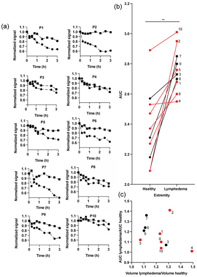 Lymphatic clearance measured by LymphMeter 1.0 in the skin of extremities of 10 patients after intradermal bolus administration of 50 µL of ICG (0.0025 mg/mL) in a solution of 5% HSA using MicronJet600TM microneedles. (a) Normalized clearance curves in lymphedematous (square) and contralateral healthy extremity (circle) for each patient. (b) AUCs for the lymphedema and the contralateral healthy extremity. Data were compared by Students t-test; ** p < 0.01. Data obtained in legs and arms are marked in red and black, respectively. (c) Correlation between ratios of AUCs and volumes in healthy and lymphedema extremities. r = −0.3647 (Pearson’s correlation coefficient), p = 0.3001. Data obtained in legs and arms are marked in red and black, respectively.