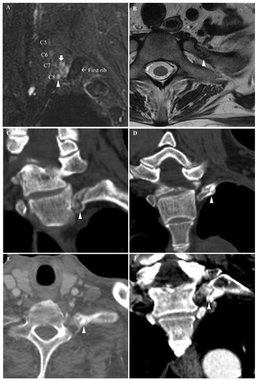 (Case 1: (A,B)) Brachial plexus and cervical spine MRI findings. (A) Parasagittal T2-weighted fat suppression image shows increased T2 signal intensity at left C8 extraforaminal nerve root (arrowhead). T2 Hyperintense area between left C8 root and the left first rib suggests soft tissue edema (short arrow). (B) Axial T2-weighted image of the cervical spine shows oblique fracture at the neck of the left first rib between the costovertebral joint and the costotransverse joint without displacement or dislocation (arrowhead). (Case 2: (C,D)) Coronal chest CT images show (C) nondisplaced fractures of the neck of the left first rib (arrowhead) and (D) the second rib (arrowhead) without dislocation at the costovertebral and costotransverse joints. (Case 3: (E,F)) Callus formation was noted at each fracture site. Chest CT images show oblique fracture of the neck of the left first rib and callus formation (arrowhead) in (E) axial image and (F) coronal image.