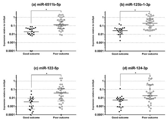 Serum expression levels of various miRNAs at 6 h after return of spontaneous circulation in patients with good and poor neurological outcomes. (a) Serum expression levels of miR-6511b-5p. (b) Serum expression levels of miR-125b-1-3p. (c) Serum expression levels of miR-122-5p. (d) Serum expression levels of miR-124-3p. Horizontal lines represent the median and error bars indicate the interquartile range. * p < 0.05.