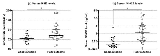 Serum levels of NSE and S100B at 6 h after return of spontaneous circulation in patients with good and poor neurological outcomes. (a) Serum levels of NSE. (b) Serum levels of S100B. Horizontal lines represent the median and error bars indicate the interquartile range. NSE—neuron-specific enolase; S100B—S100 calcium-binding protein B. * p < 0.05.