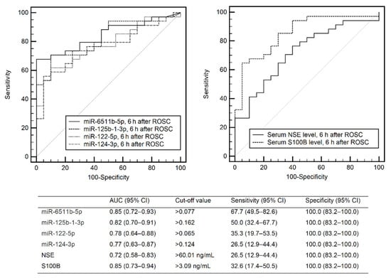 Receiver operating characteristic curves for 6-month poor neurological outcome based on the expression levels of miRNAs and NSE or S100B. NSE—neuron-specific enolase; S100B—S100 calcium-binding protein B; ROSC—return of spontaneous circulation; AUC—area under the curve; CI—confidence interval.