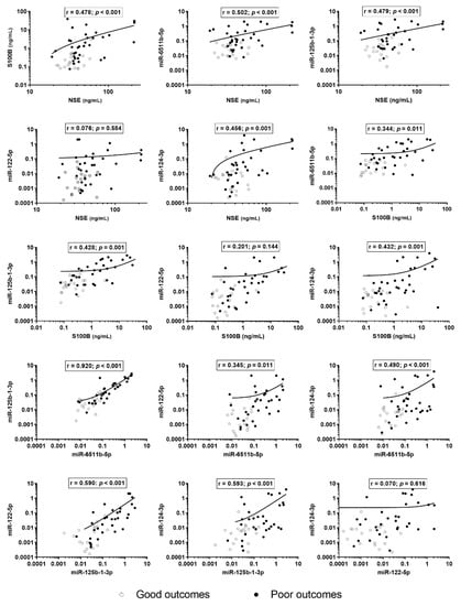 The correlation between protein and miRNA biomarkers. Log-transformed values of biomarkers and miRNA expressions are represented. Since the axis is logarithmic, values equal to zero or lower than the lowest marked value on the axis are not included on the graph. NSE—neuron-specific enolase; S100B—S100 calcium-binding protein B.