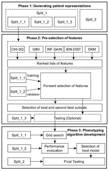 In Phase 1, the Bag of Words scheme in text mining led to a complete clinical dataset with a total of 27,293 different single codes, which means a patient-term matrix of 9657 × 27,293 dimensions was created to represent patient profiles. As described above, this dataset was further split into the subsets of Split_1_1, Split_1_2, and Split_1_3 for feature selection and Split_2 for evaluating the generalisation performance of optimal phenotyping algorithm in grid-search.